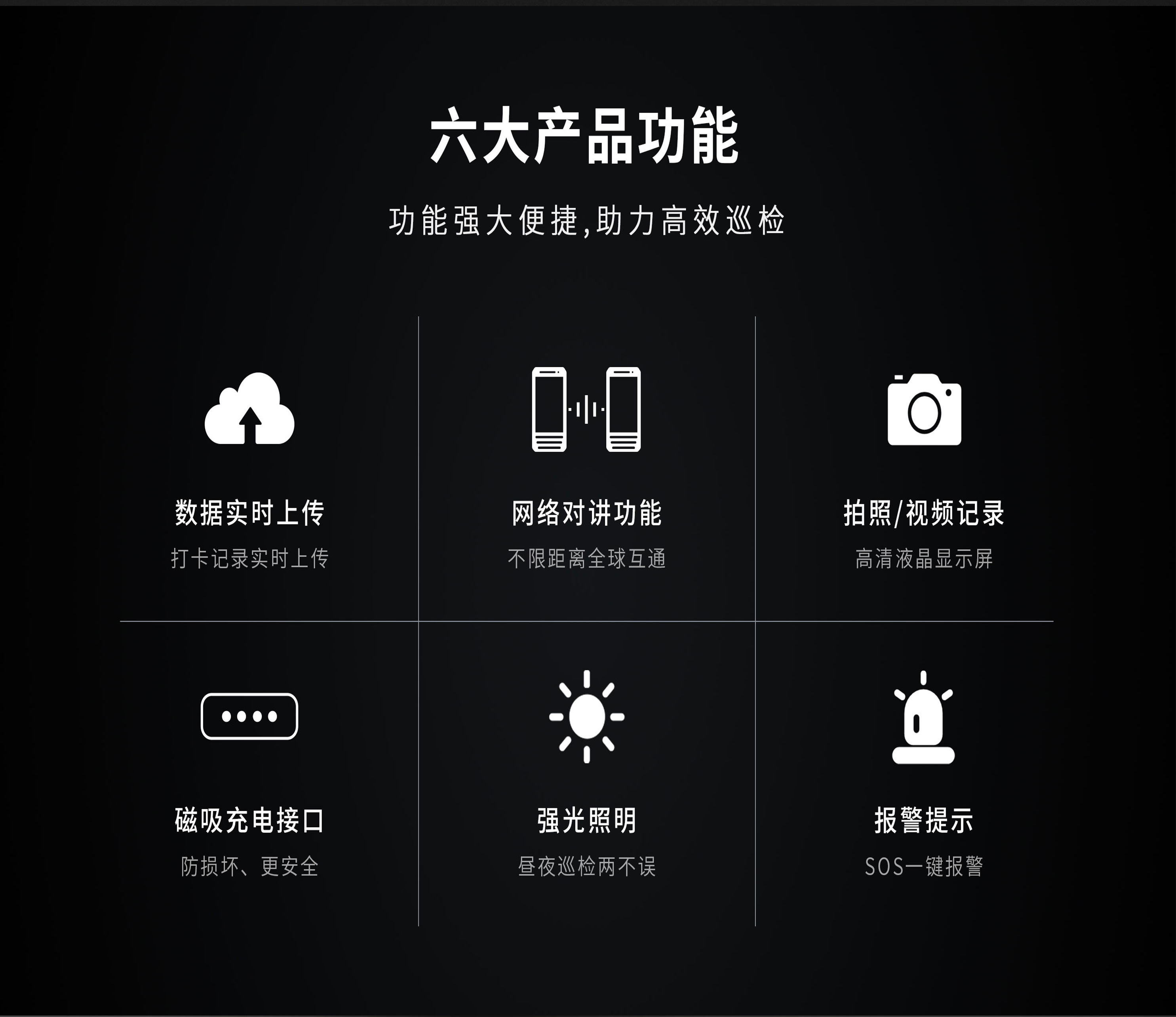 數據實時上傳(打卡記錄實時上傳)  、網絡對講功能(不限距離全球互通)、拍照/視頻記錄(高清液晶顯示屏)、磁吸充電接口(防損壞、更安全)、強光照明(晝夜巡檢兩不誤)、報警提示(SOS一鍵報警)