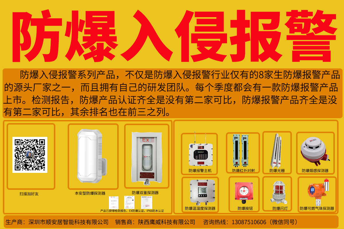 防爆入侵報警產品是為防爆區域入侵報警系統而設計的專用防爆入侵報警產品。陜西鷹威科技有限公司是一家集開發、生產、銷售為一體的生產防爆入侵報警產品的專業化生產廠家。作為防爆入侵報警產品生產廠家主要的產品系列有: